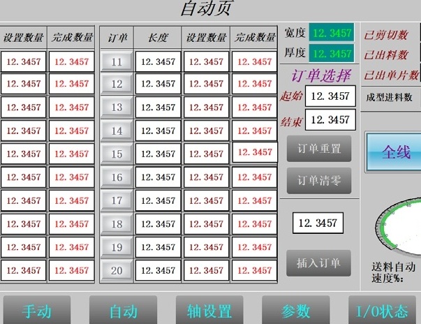 本系统主要采用西门子硬件组成,主CPU采用西门1500系列,伺服采用V90,主要送料部分采用精确度更高,响应更快的S210 伺服,变频则采用 G120 系列。全系统采用 PROFINET 通讯,响应速度快、更稳定,方便故障排查。操作也更加简便。